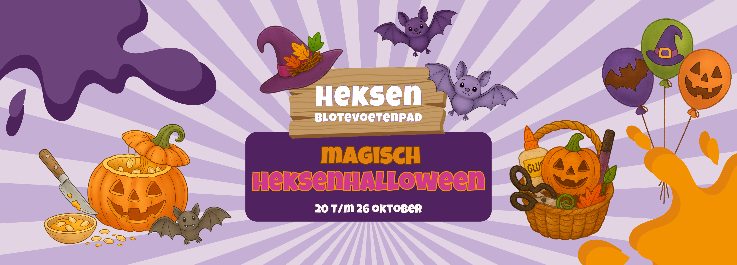 In de herfstvakantie, van 20 t/m 26 oktober, bruist het Heksenblotevoetenpad van griezelige gezelligheid, vrolijke creativiteit en moddermagie. Trek je gekste, griezeligste of mafste Halloween-outfit aan en zet het Heksenblotevoetenpad op stelten. Hoe gekker, hoe beter!